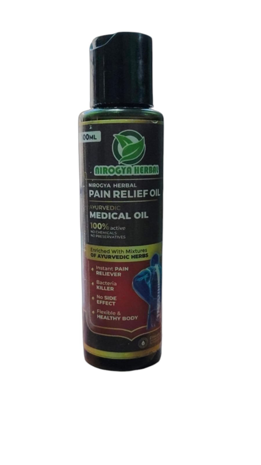 Nirogya Pain Relief Oil is a powerful Ayurvedic blend designed to provide quick and long-lasting relief from joint pain, muscle stiffness, backache, and body aches. Enriched with the healing properties of herbs like Gandhpura (Wintergreen), Nirgundi, Camphor, Eucalyptus, and Clove Oil, it penetrates deep into the affected areas to reduce inflammation and improve mobility. Its soothing aroma and warming effect relax the muscles and promote better circulation. Ideal for daily use, this non-sticky oil is free from harmful chemicals—offering a safe, natural solution for pain management.